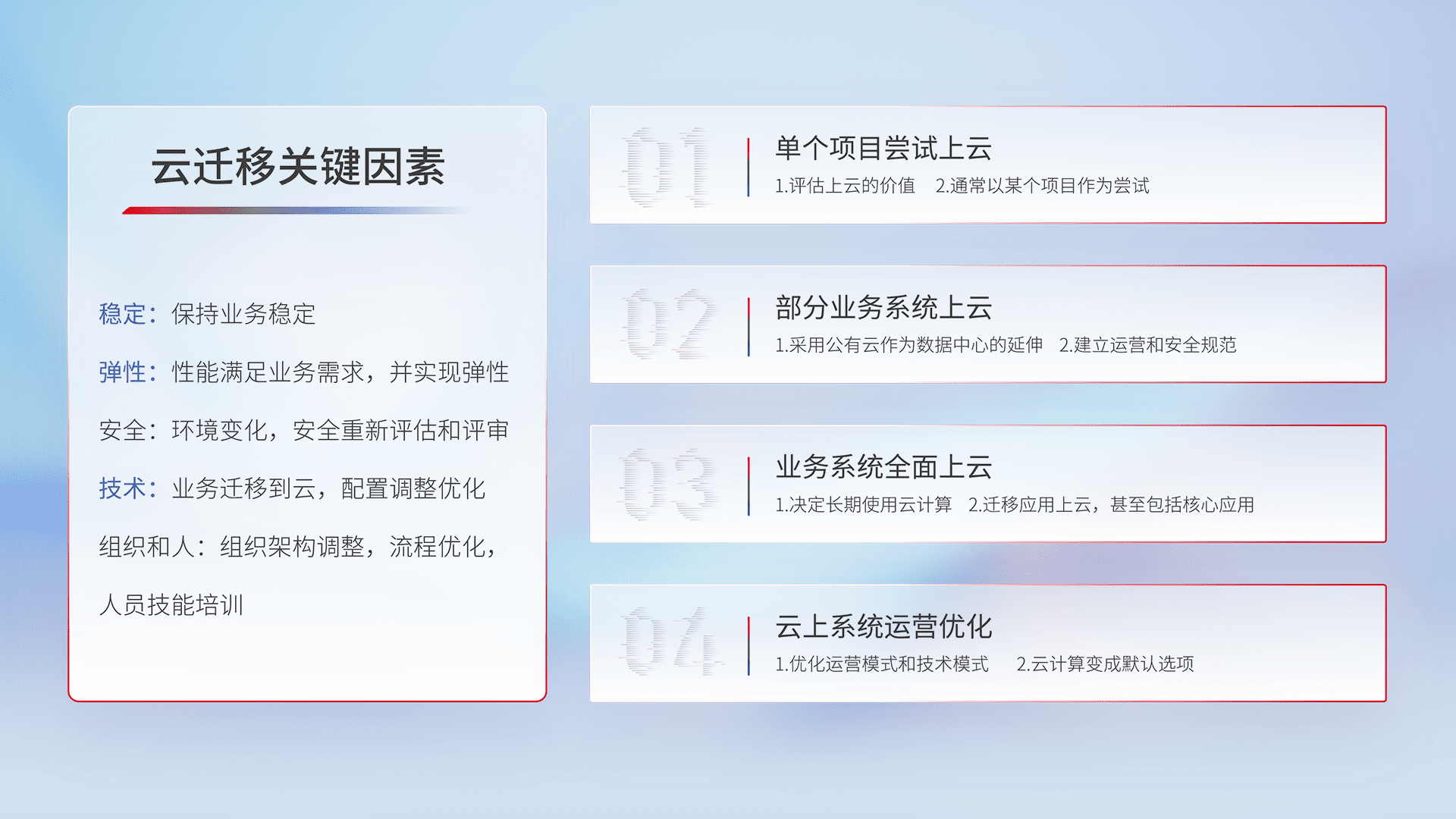结合实际业务,,,,从规划设计、、、云平台选型、、、、云原生改造、、数据迁移、、、集成交付,,,迁移全过程为客户识别最佳上云路径,,做好风险识别管理,,设计网络架构、、、身份权限、、安全审计合规、、操作审计、、日志审计、、监控告警策略、、、多站点容灾设计等,,对云上基础设施进行整体规划,,,提升IT治理水平,,以满足弹性、、、、高可用、、、、高性能的需求。。
